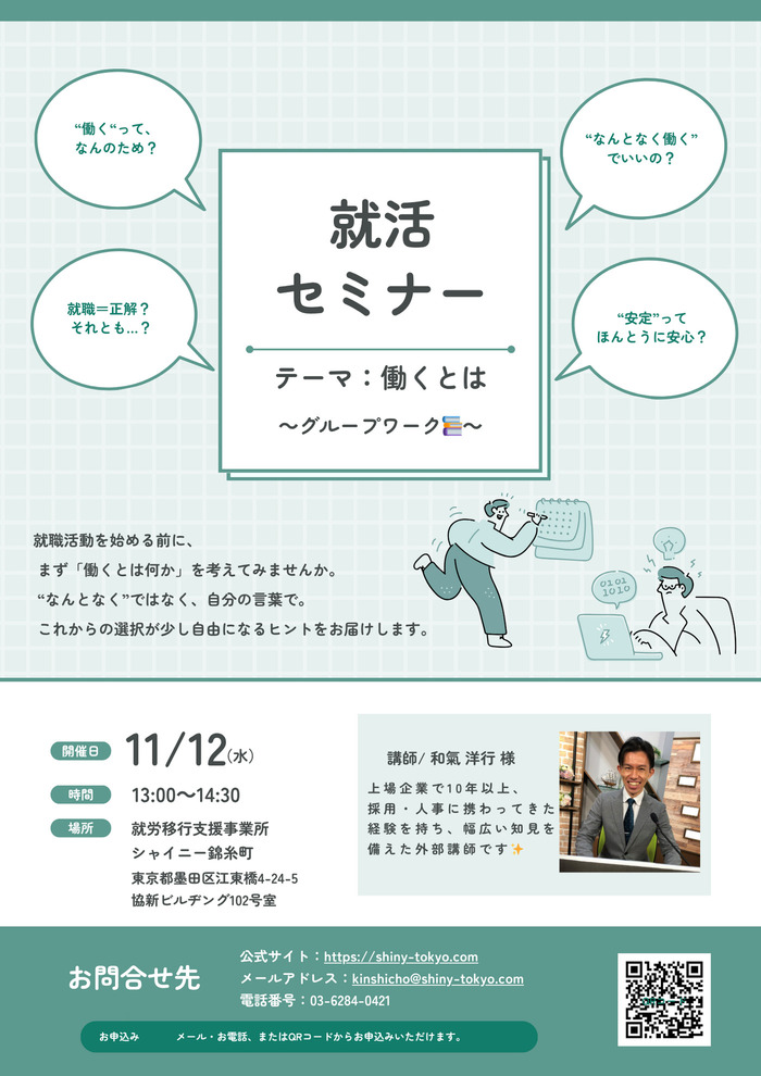 11月の外部講師和氣様による就活セミナーは、テーマ「働くとは」です!