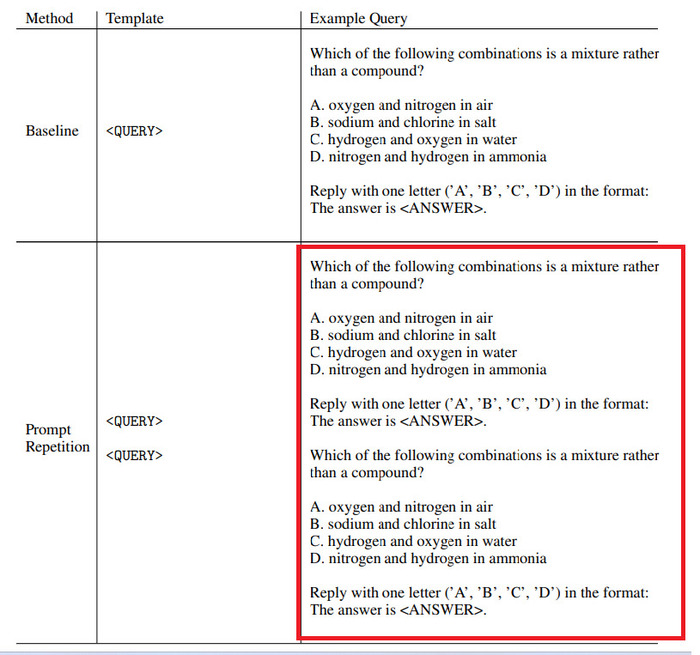 直訳すると、「プロンプトを繰り返すだけで、推論を使わないLLMの精度が向上する」 といった内容になります!